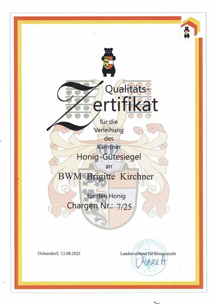 Zusätzlich werden Honigproben an den Kärntner Imkerbund eingesendet, um nach verschiedenen Kriterien beurteilt zu werden. Entspricht der Honig den hohen Anforderungen der Qualitätsrichtlinien wird für die beprobte Honigernte das Kärntner Honiggütesiegel, ein anerkanntes Qualitätssiegel, verliehen. In der Gewinnung der Erzeugnisse wird besonderen Wert auf Qualität und Hygiene gelegt.